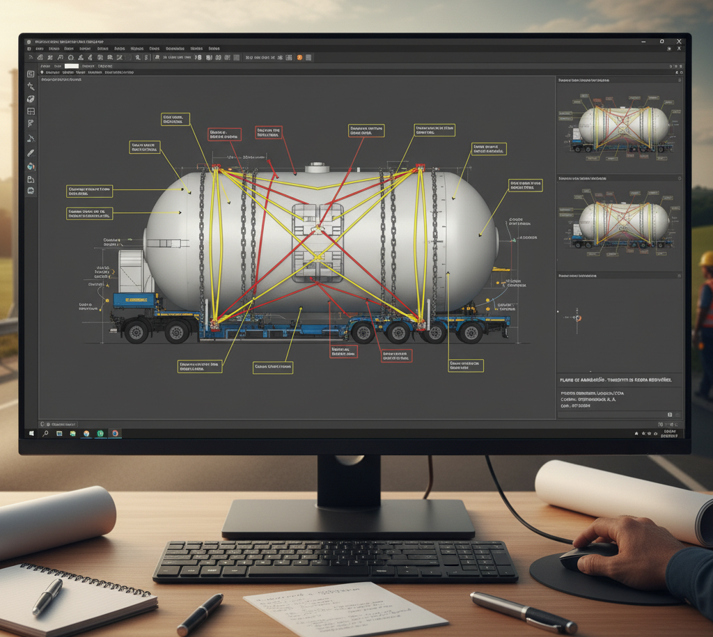 Um plano de amarração é um documento técnico que define como uma carga indivisível (como máquinas, estruturas metálicas ou equipamentos de grande porte) deve ser fixada em um veículo para transporte. Ele descreve os pontos de ancoragem, o tipo de cintas, correntes ou cabos a serem usados, a quantidade necessária de amarrações e a forma correta de aplicá-las.
