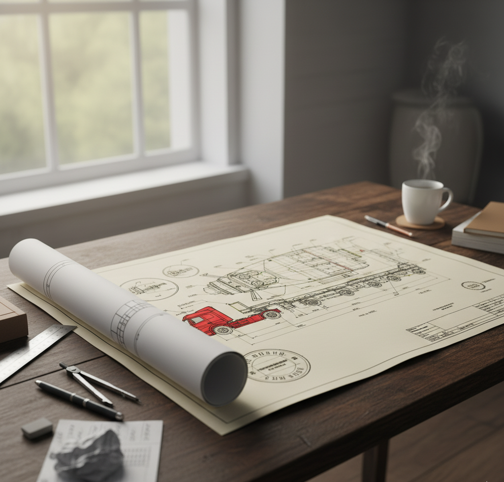 O processo de dimensionamento de um transporte especial pode ser desafiador, pois são vários aspectos técnicos que precisam ser levados em consideração. Alguns desses aspectos podem ser melhor observados e analisados através dos Desenhos Técnicos do conjunto transportador com a carga. Ele permite verificar, por exemplo, as dimensões e raios de curvatura requeridos, o conjunto transportador que atenda a legislação vigente e capacidade técnicas dos equipamentos de transporte.